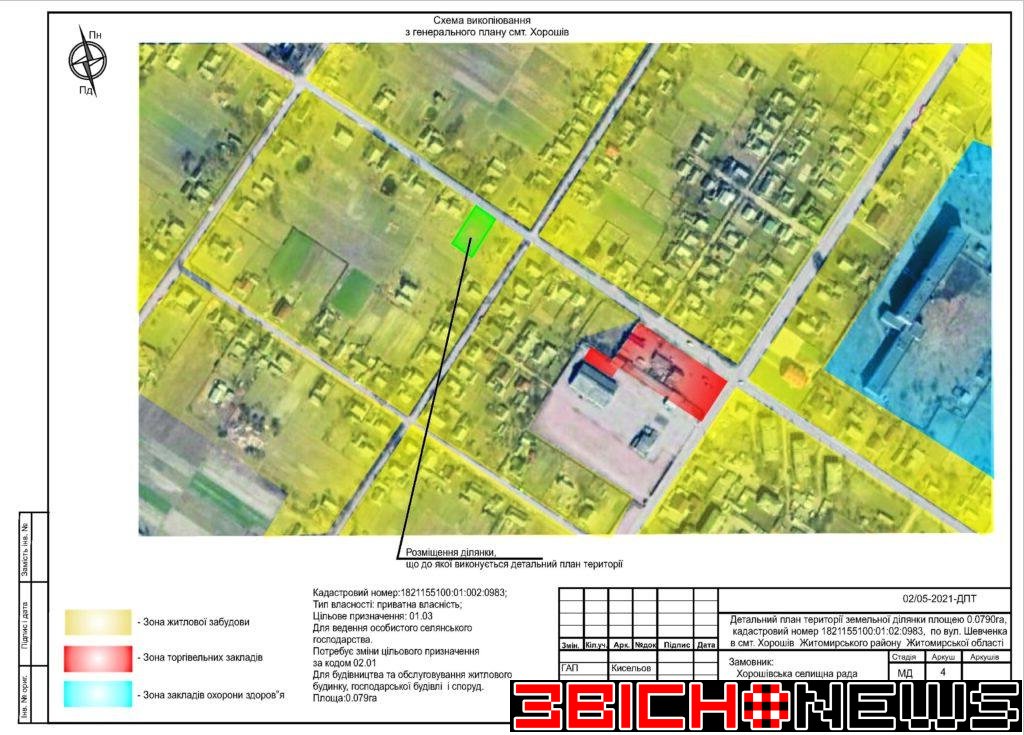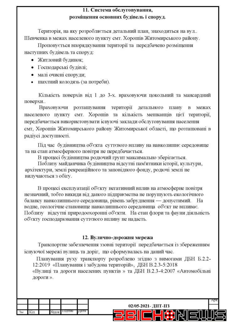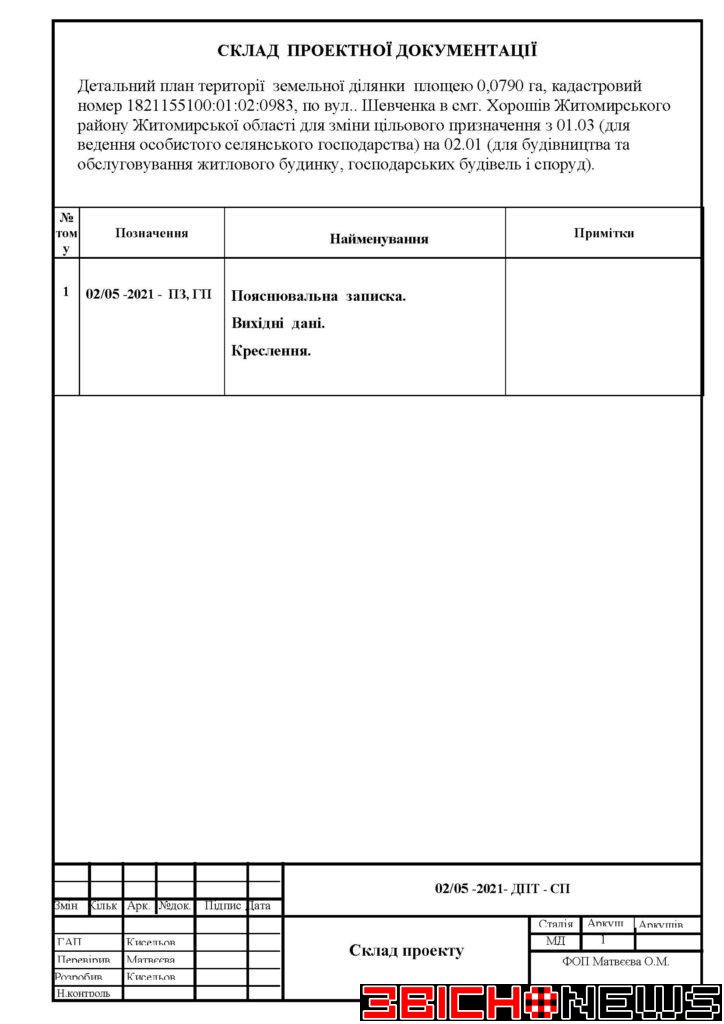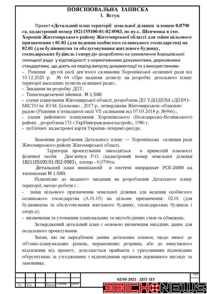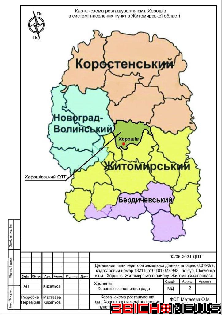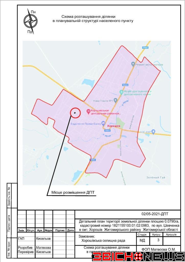 Відповідно до статті 21 Закону України «Про регулювання містобудівної діяльності», Постанови Кабінету Міністрів України від 25.05.2011 № 555 «Про затвердження Порядку проведення громадських слухань щодо врахування громадських інтересів під час розроблення проєктів містобудівної документації на місцевому рівні» Хорошівська селищна рада повідомляє про початок процедури розгляду та врахування пропозицій громадськості щодо змін до проєкту містобудівної документації, а саме: «Детальний план території земельної ділянки площею 0,0790га, кадастровий номер 1821155100:01:02:0983 по вул. Шевченка в смт. Хорошів Житомирського району Житомирської області для зміни цільового призначення з 01.03 (для ведення особистого селянського господарства) на 02.01 (для будівництва та обслуговування житлового будинку, господарських будівель і споруд)».