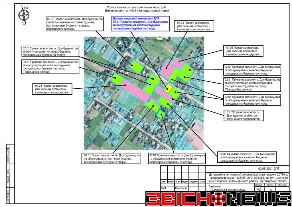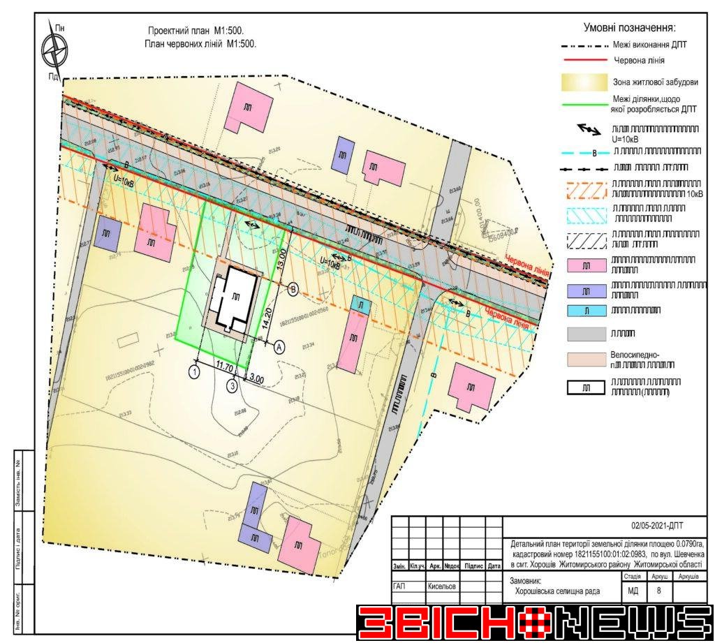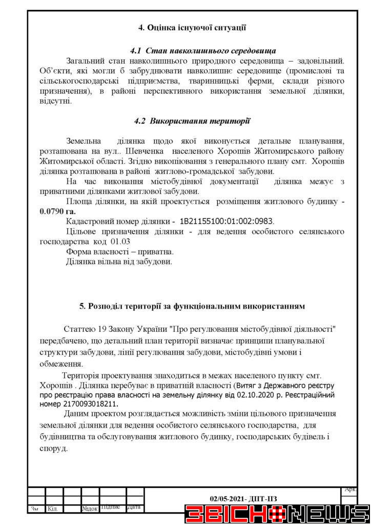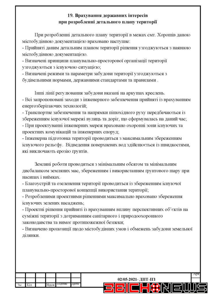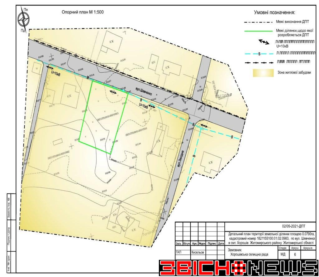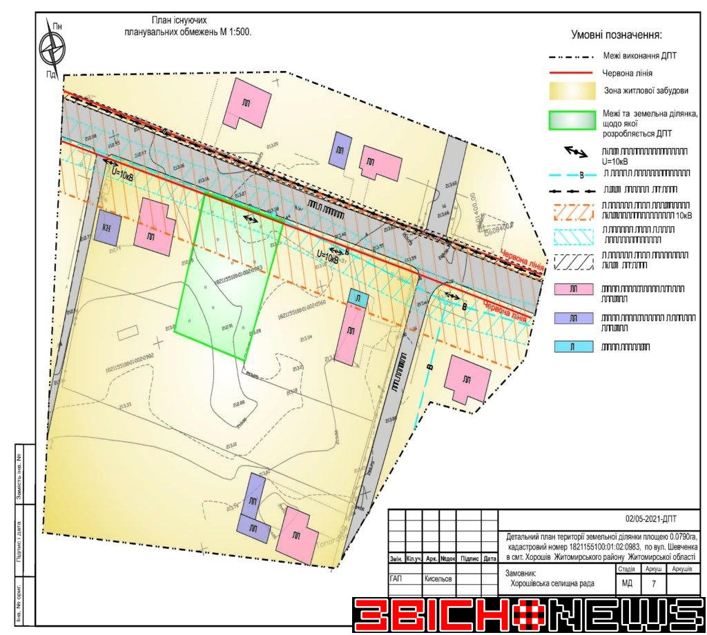 Відповідно до статті 21 Закону України «Про регулювання містобудівної діяльності», Постанови Кабінету Міністрів України від 25.05.2011 № 555 «Про затвердження Порядку проведення громадських слухань щодо врахування громадських інтересів під час розроблення проєктів містобудівної документації на місцевому рівні» Хорошівська селищна рада повідомляє про початок процедури розгляду та врахування пропозицій громадськості щодо змін до проєкту містобудівної документації, а саме: «Детальний план території земельної ділянки площею 0,0790га, кадастровий номер 1821155100:01:02:0983 по вул. Шевченка в смт. Хорошів Житомирського району Житомирської області для зміни цільового призначення з 01.03 (для ведення особистого селянського господарства) на 02.01 (для будівництва та обслуговування житлового будинку, господарських будівель і споруд)».
