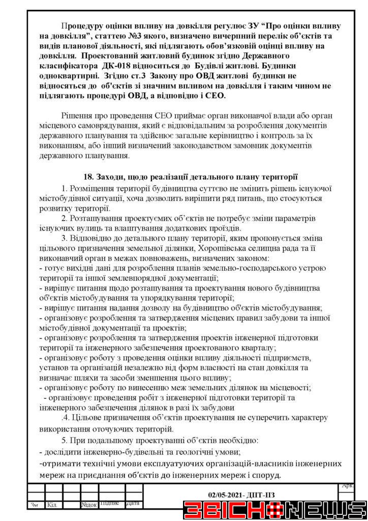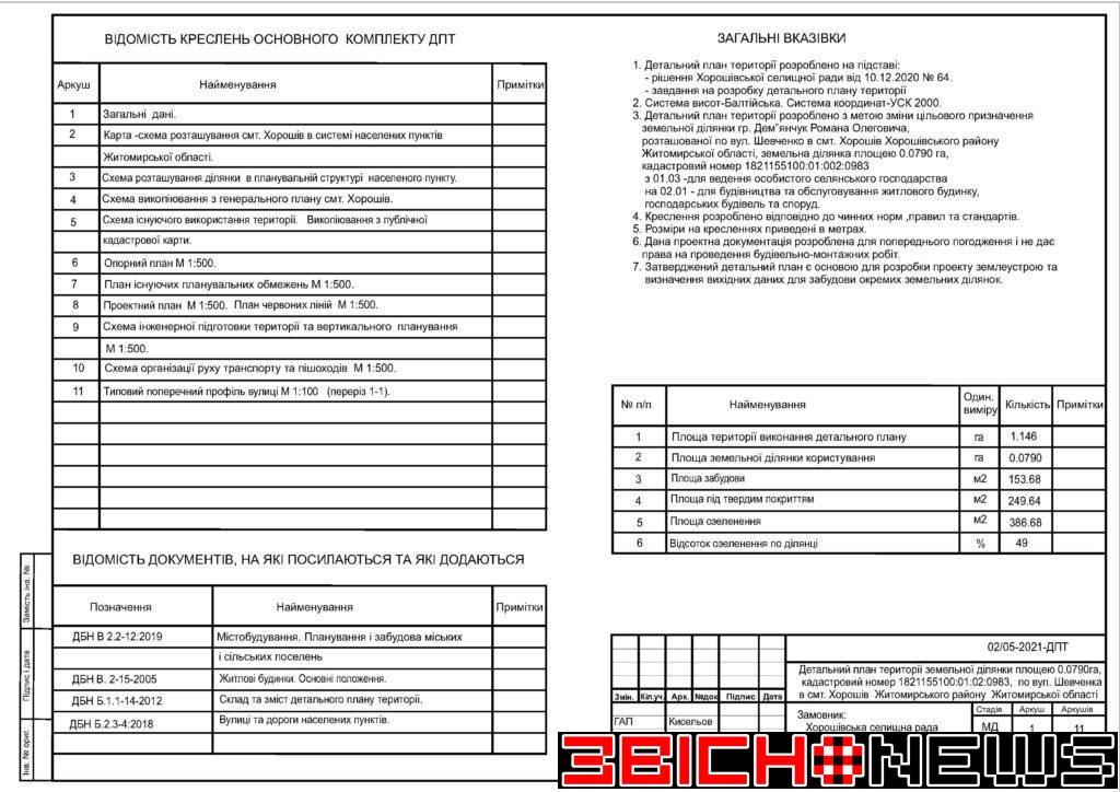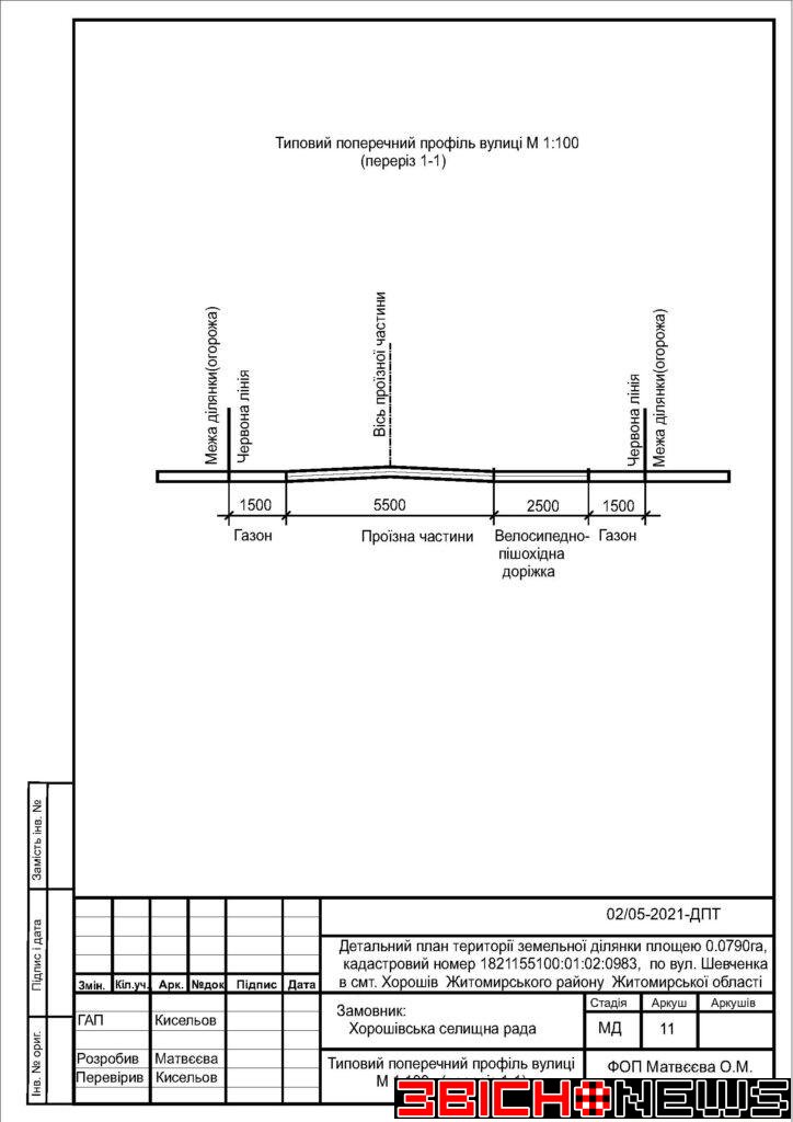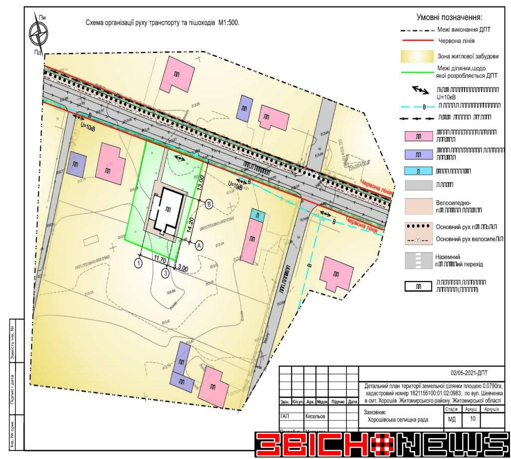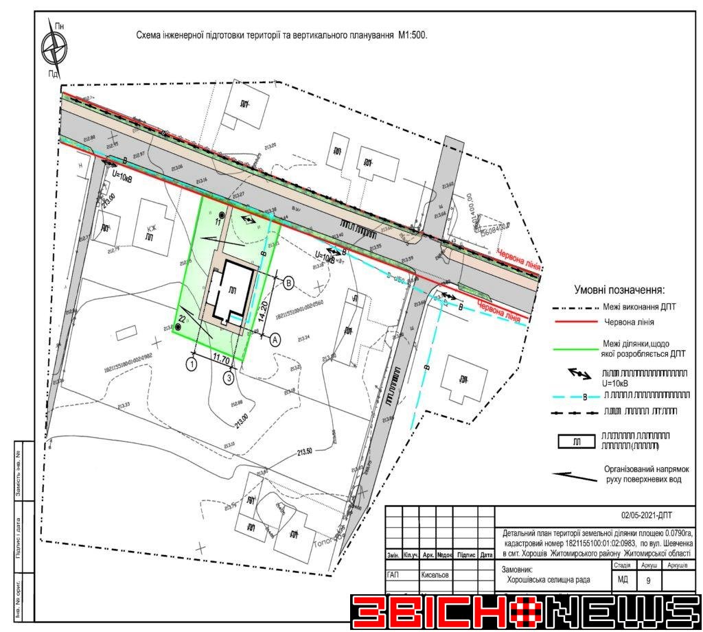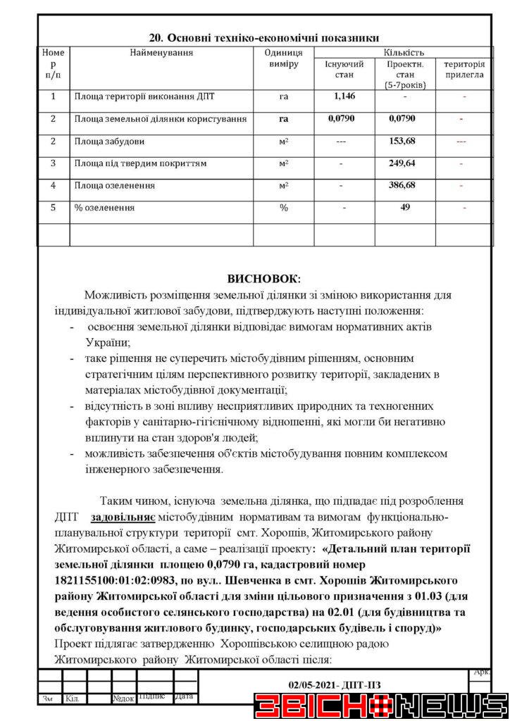 Відповідно до статті 21 Закону України «Про регулювання містобудівної діяльності», Постанови Кабінету Міністрів України від 25.05.2011 № 555 «Про затвердження Порядку проведення громадських слухань щодо врахування громадських інтересів під час розроблення проєктів містобудівної документації на місцевому рівні» Хорошівська селищна рада повідомляє про початок процедури розгляду та врахування пропозицій громадськості щодо змін до проєкту містобудівної документації, а саме: «Детальний план території земельної ділянки площею 0,0790га, кадастровий номер 1821155100:01:02:0983 по вул. Шевченка в смт. Хорошів Житомирського району Житомирської області для зміни цільового призначення з 01.03 (для ведення особистого селянського господарства) на 02.01 (для будівництва та обслуговування житлового будинку, господарських будівель і споруд)».