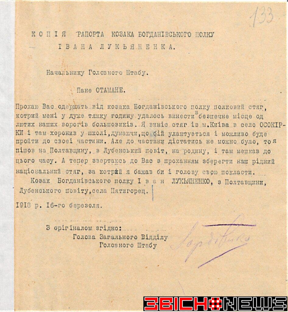Сьогодні до Вашої уваги пропонуємо ще один документ, що зберігся у фонді 1076 – Військове міністерство Української Народної Республіки, оп. 1, спр. 14, арк. 133. Це – копія рапорту козака Богданівського полку Івана Лукьяненка, що засвідчує непохитну вірність борців за незалежність України національному стягу, за який готові були віддати своє життя.