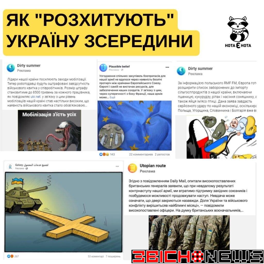 Щодня в українському сегменті фейсбуку зʼявляються десятки нових сторінок, з яких запускають антиукраїнську рекламу. Переважно це пости, які посилаються на західні медіа та різних експертів і поширюють маніпуляції, фейки та викривлену інформацію на теми, які стосуються мобілізації, влади чи експорту пшениці. Теми змінються відповідно до ситуації на міжнародній арені та на полі бою.