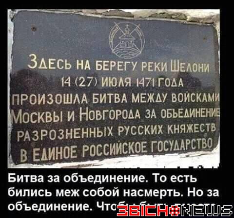 На пам’ятному меморіальному знаку – хитра казуїстична спроба приховати експансію та агресію москви щодо Новгорода. Згідно з нею виходить, що і Новгородська республіка, що обрала суверенне існування, і московська держава, що здійснювала експансію поглинання – обидва боролися один з одним за спільне “об’єднання”))