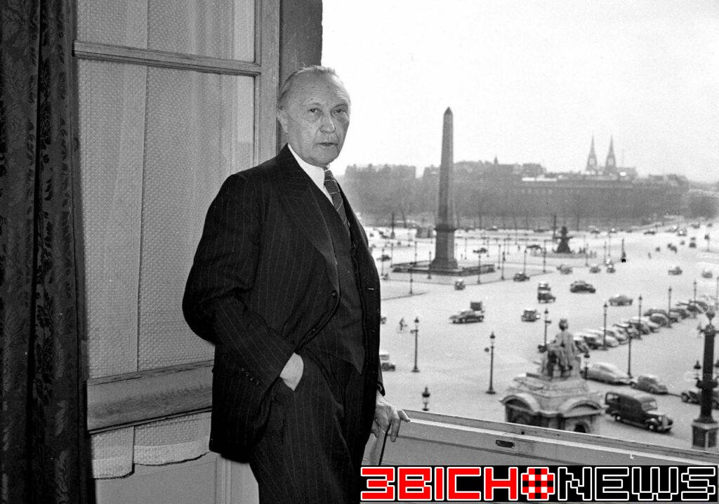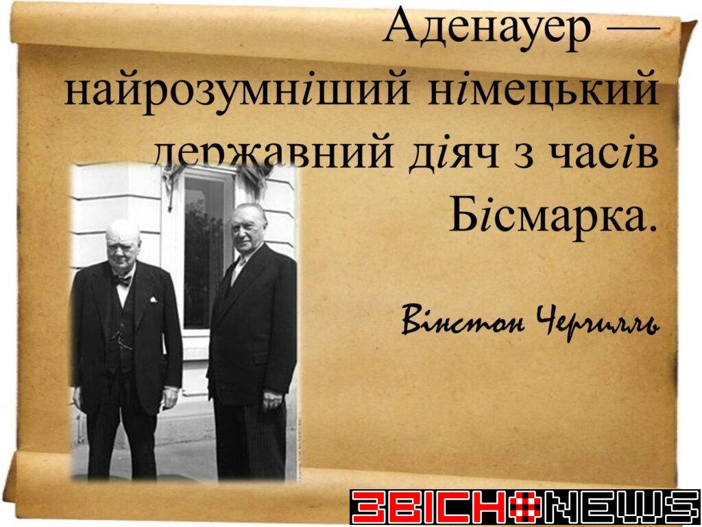 P. S. Конрад Герман Йозеф Аденауер (5 січня 1876, Кельн, Німецька імперія — 19 квітня 1967, Бад-Гоннеф, Північний Рейн-Вестфалія, ФРН) — німецький політик та державний діяч, співзасновник Християнсько-демократичного союзу. Перший канцлер Західної Німеччини (1949—1963). Відіграв значну роль у творенні ФРН як незалежної демократичної держави, пов’язаної із Заходом. Разом із президентом Франції де Голлем він працював над примиренням Франції та Німеччини й посиленням Західного блоку в Європі.