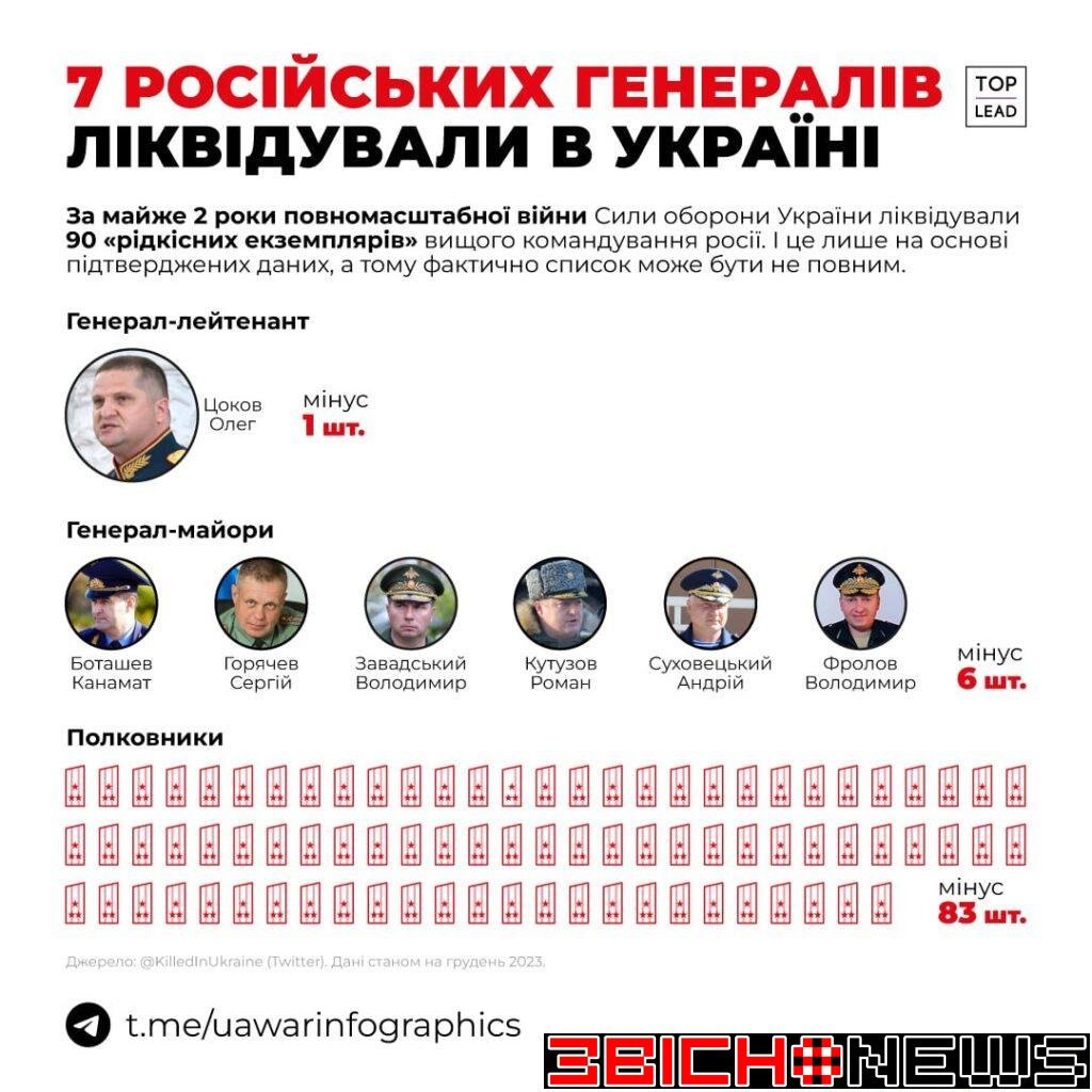 За майже два роки війни тільки згідно з підтвердженими даними українські війська ліквідували щонайменше сім російських генералів та 83 полковників. Реальні втрати вищого командного складу рф можуть бути ще вищими.