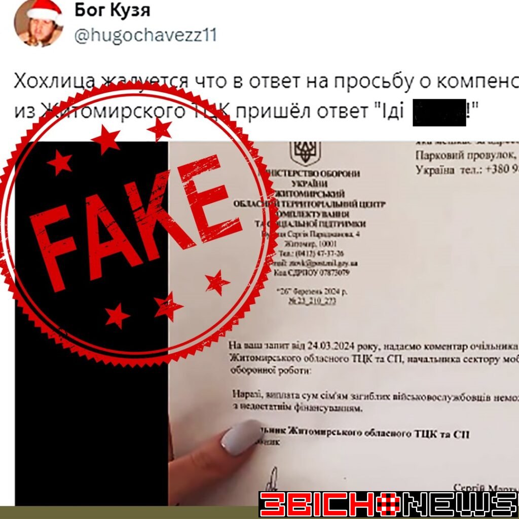 “Така особа не зверталася до Житомирського ТЦК і СП за оформленням виплат. Документ на відео не відповідає стандартам діловодства ЗСУ”, — повідомив заступник начальника сектору соціальних виплат Житомирського ТЦК і СП Олександр Негерей.