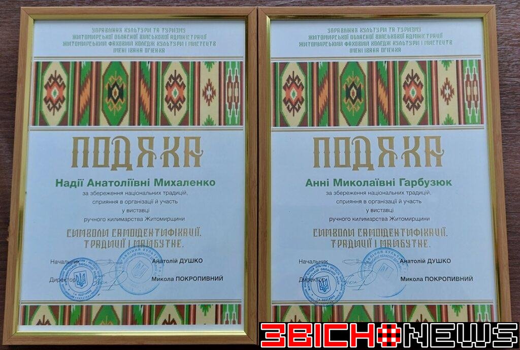За участь у підготовці обласної виставки килимів відзначені подяками управління культури та туризму Житомирської обласної військової адміністрації та Житомирського фахового коледжу культури і мистецтв ім.