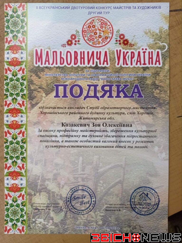 Високу професійну майстерність та вагомий особистий внесок у розвиток культурно-мистецького виховання дітей викладачки Зої Козакевич журі конкурсу відзначило Подякою.