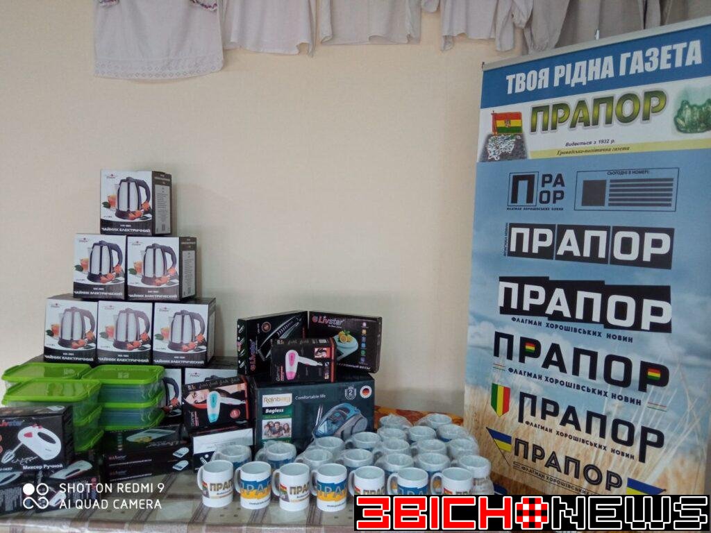 Власниками подарунків від «Прапора» стали: Василь Олександрович Мельник (Хорошів), Алла Василівна Василенко (Нова Борова), Світлана Вікторівна Калатушкіна (Старий Бобрик), Ніна Василівна Бігоцька (Солодирі), Валентина Миколаївна Мошківська (Хорошів), Олена Василівна Макарова (Хорошів), Іванна Василівна Баник (Сколобів), Ольга Петрівна Седляр (Рижани), Наталія Володимирівна Скаковська, (Дворище), Ніна Володимирівна Кирилович (Галинівка), Наталія Миколаївна Ваховська (Рижани), Ратушнюк Іван Олександрович (Хорошів), Тетяна Зіновіївна Романова (Хорошів), Світлана Олександрівна Кулаківська (Хорошів), Тамара Володимирівна Павлюк (Хорошів), Галина Василівна Сівченко, (Хорошів), Валентина Анатоліївна Корзун (Дворище), Дмитро Володимирович Колодій (Зубринка), Сергій Андрійович Костриця (Хорошів), Тетяна Василівна Федоренко (Хорошів), Олексій Гнатович Ющенко (Гацьківка), Олександр Федорович Арсенюк (Старий Бобрик), Любов Олексіївна Ільїна (Дворище), Галина Василівна Маслюченко (Рижани), Тетяна Петрівна Антонюк (Хорошів), Олександр Сергійович Шевчук (Хорошів), Віра Олександрівна Михаленко, (Хорошів), Михайло Миколайович Сокирко (Хорошів), Василь Миколайович Нонік (Хорошів), Василь Іванович Кривець (Хорошів), Ганна Яківна Струкова (Рижани), Віра Матвіївна Нечипоренко (Хорошів), Галина Петрівна Поліщук (Хорошів). Тамара Олександрівна Яремчук (Радичі), Сергій Йосипович Штиль (Хорошів), Ігор Степанович Василенко (Дворище), Віра Олександрівна Козакевич (Хорошів), Юрій Олександрович Костриця (Сколобів), Ніна Леонідівна Скалозуб (Хорошів), Ганна Миколаївна Куліш (Хорошів), Ігор Васильович Денисюк (Хорошів), Галина Григорівна Уздєнова (Черняхів), Валентина Григорівна Онофріюк (Хорошів), Сергій Васильович Онищук (Невирівка), Тетяна Олександрівна Шарненкова (Хорошів), Тетяна Віталіївна Зайченко (Хорошів), Ольга Адамівна Зубрицька (Рижани), Тетяна Миколаївна Тарабріна (Хорошів), Володимир Дмитрович Пантус (Дворище), Наталія Миколаївна Данильчук (Хорошів), Наталія Василівна Рогальська (Хорошів), Ганна Григорівна Левківська (Дворище), Оксана Степанівна Гомонюк (Дворище), Лідія Василівна Ющенко (Будо-Рижани), Руслана Олексіївна Нагорська (Поромівка), Лідія Олександрівна Загребельна (Дворище).