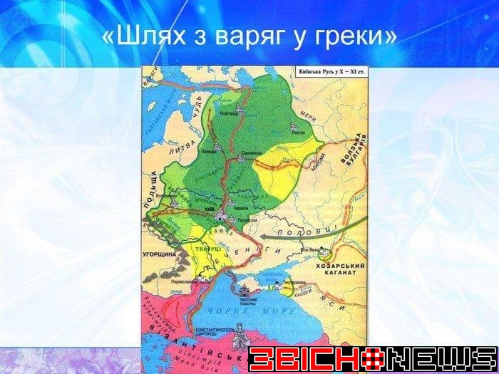 Територією України пролягав один з найбільших історичних транспортних шляхів — «шлях із варяг у греки» — система річкових шляхів і волоків між ними завдовжки 3 тис. км, що пов’язувала північні землі Давньої Русі з південними руськими землями та Балтійське море з Чорним.